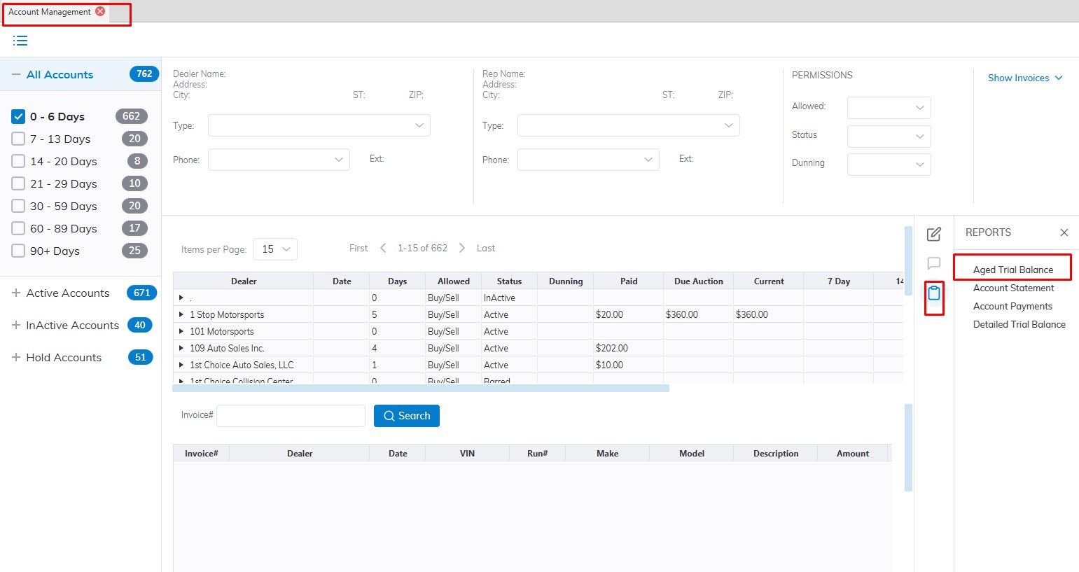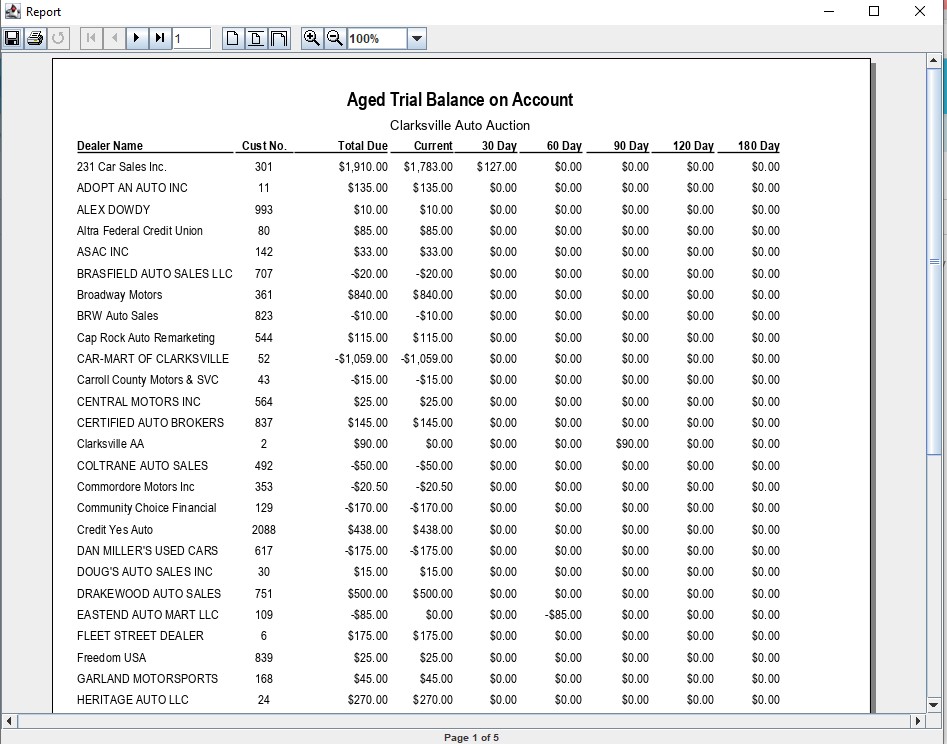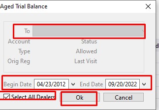 The 'Aged' Trial Balance provides a view of Receivables relative to the passage of time since posting. This may help to identify which Dealers to collect from first. The report is aged according to: