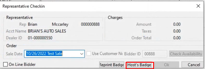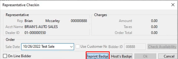 Re-printing a bid badge may also be done from a different application than the original printing ' Rep Check In ' order. This allows the Auction to guard against printing multiple bid badges with the same bidder id. Since reprints are done from the Sale Profile application protecting against numerous copies of a bidder badge is easy. As only authorized persons with user permission can print and register the original buyer in the Dealer Profile application. While other staff can be permitted only to reprint what was already generated upon request from the Sale Profile Application.