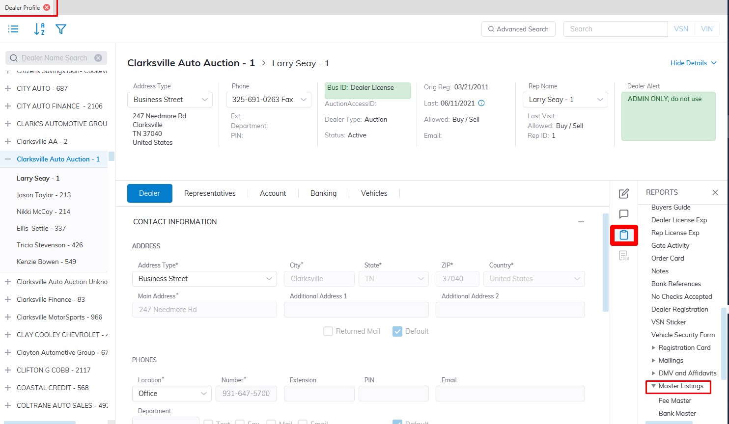 The Dealer Profile application > Reports > Administrative Reports > Master Listings > Bank Master