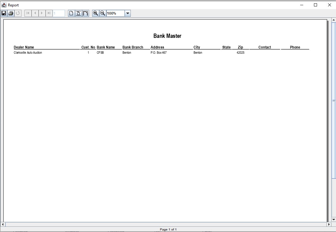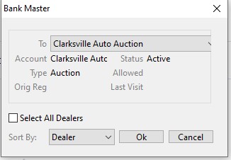 This will launch the Bank Master Report form. You may run the report for 'All Dealers' or only one.