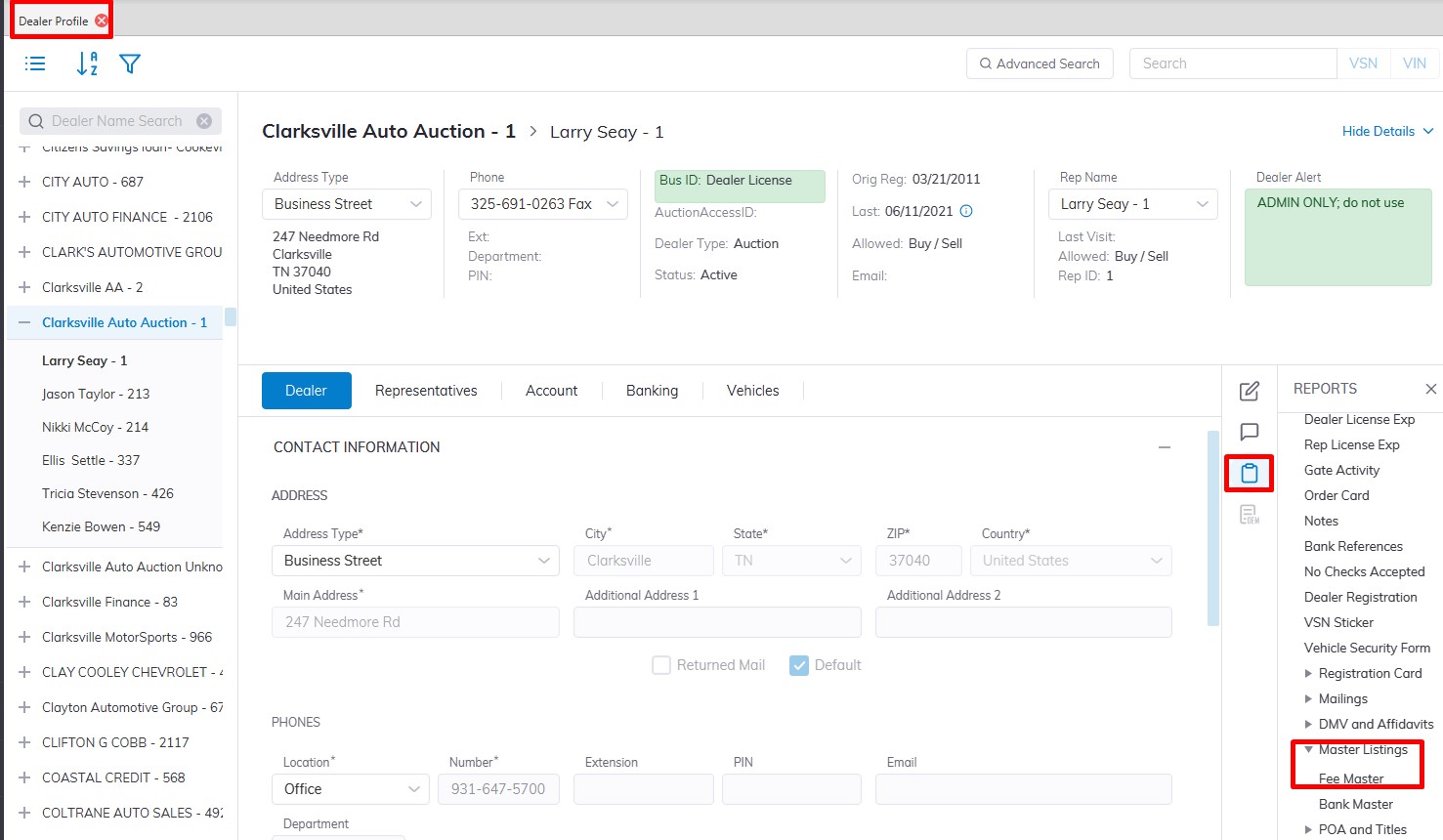 The Dealer Profile application > Reports > Administrative Reports > Master Listings > Fee Master