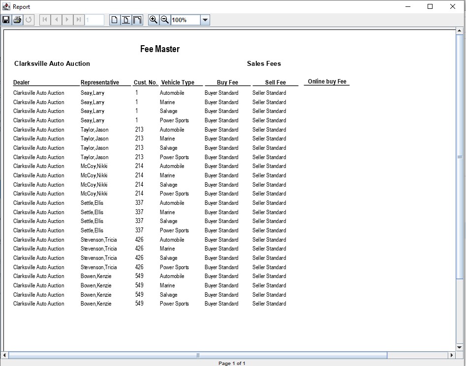 The Fee Master report is used to provide details on what rates the Auction has set up to charge its customers for Sales, Registration, Transportation, and settlement Fees.