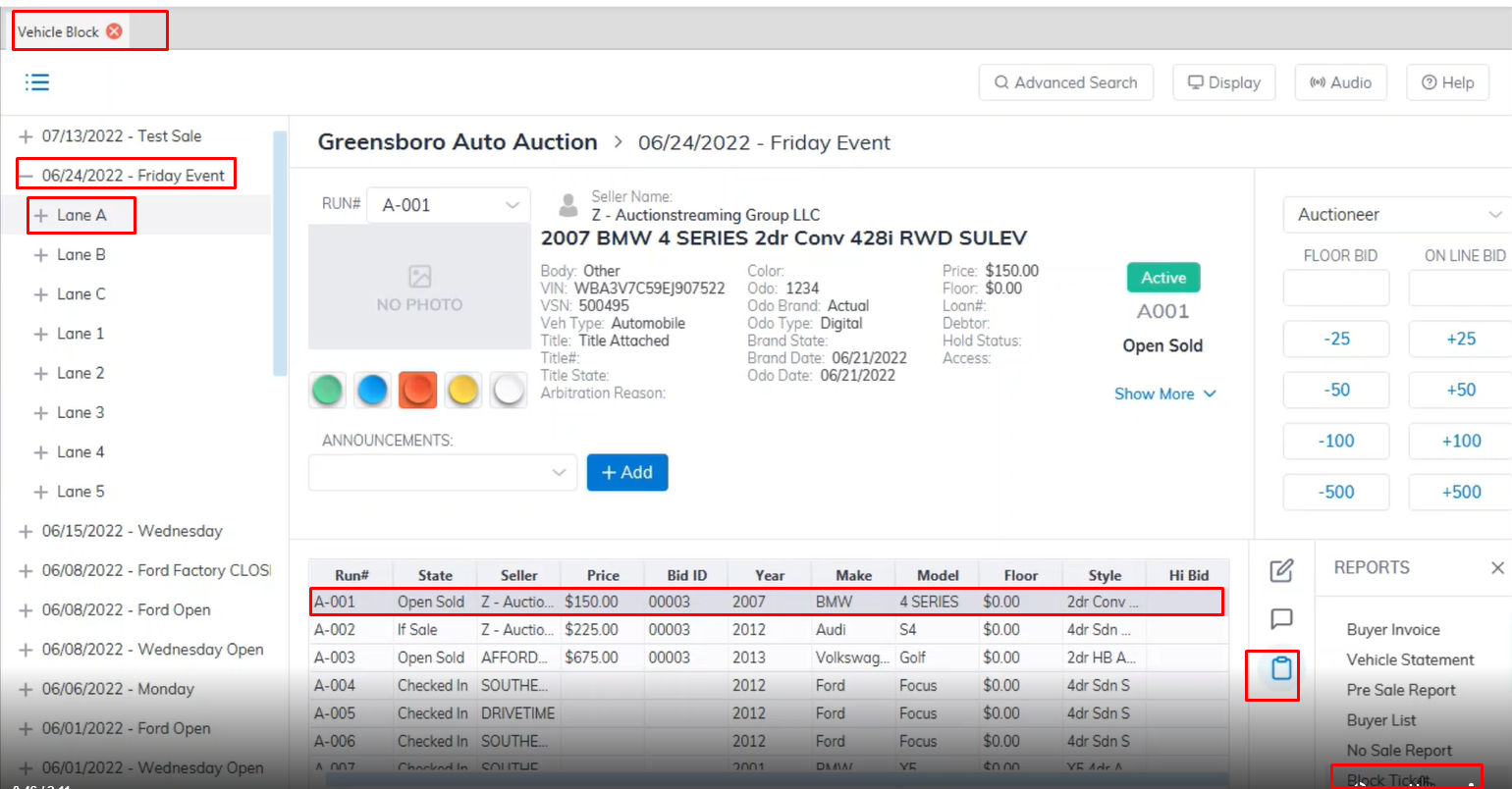 - Select the vehicle you want to print the Block ticket for (The vehicle must be in a Sold State)