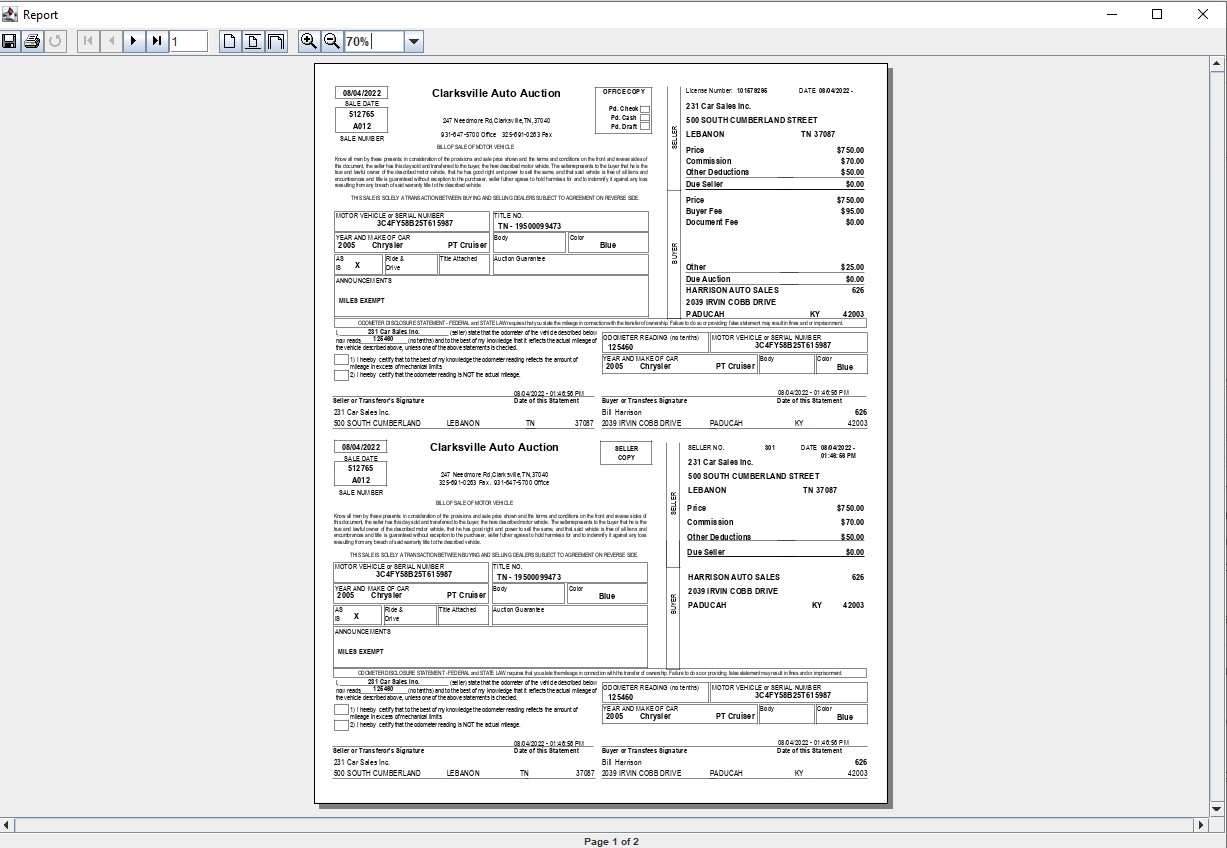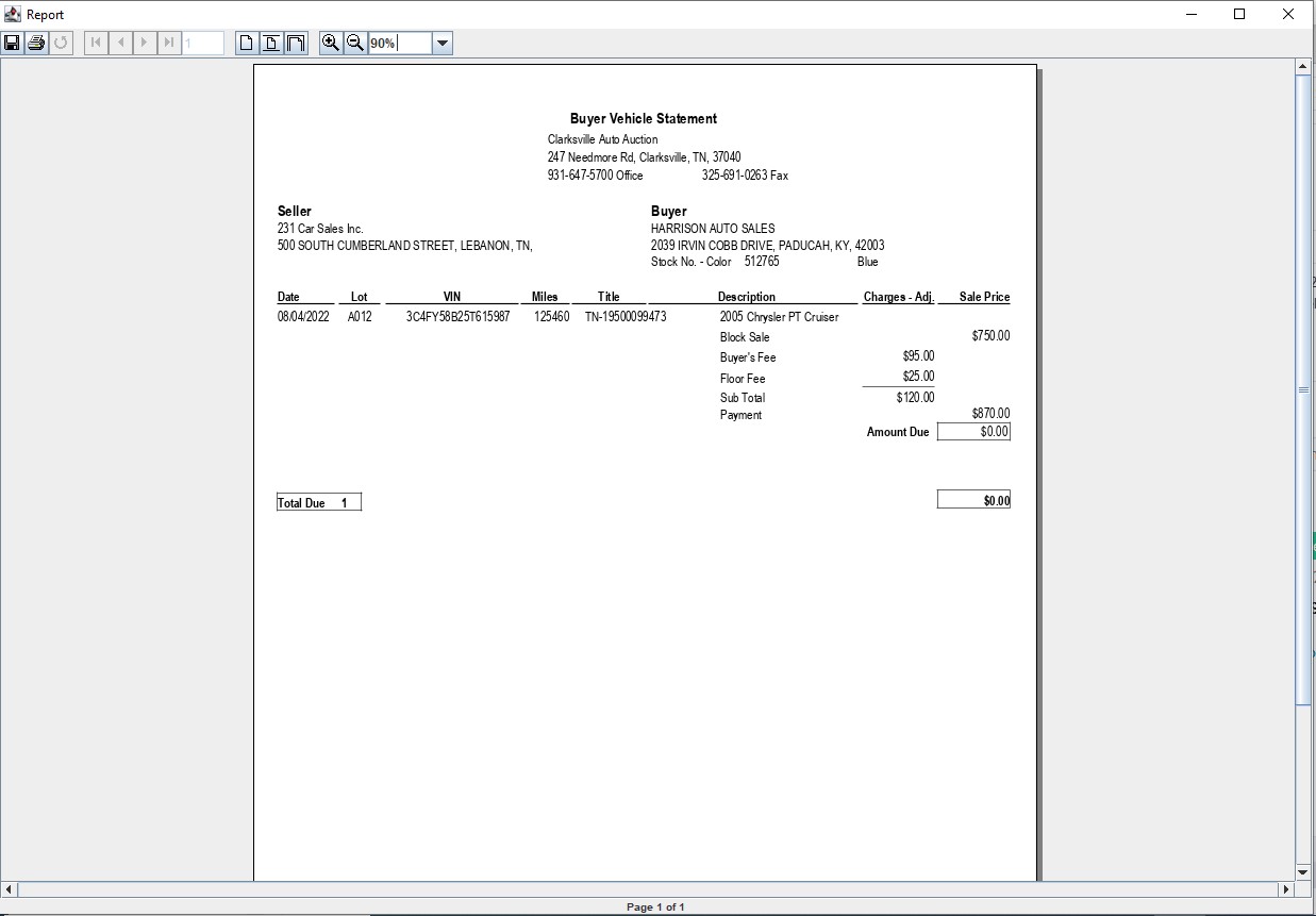 The Buyer Invoice prints automatically when a vehicle is sold from the Vehicle Block application. It may also be re-printed from the Dealer Profile or Vehicle Orders application. Each Buyer Invoice is unique for the Auction.