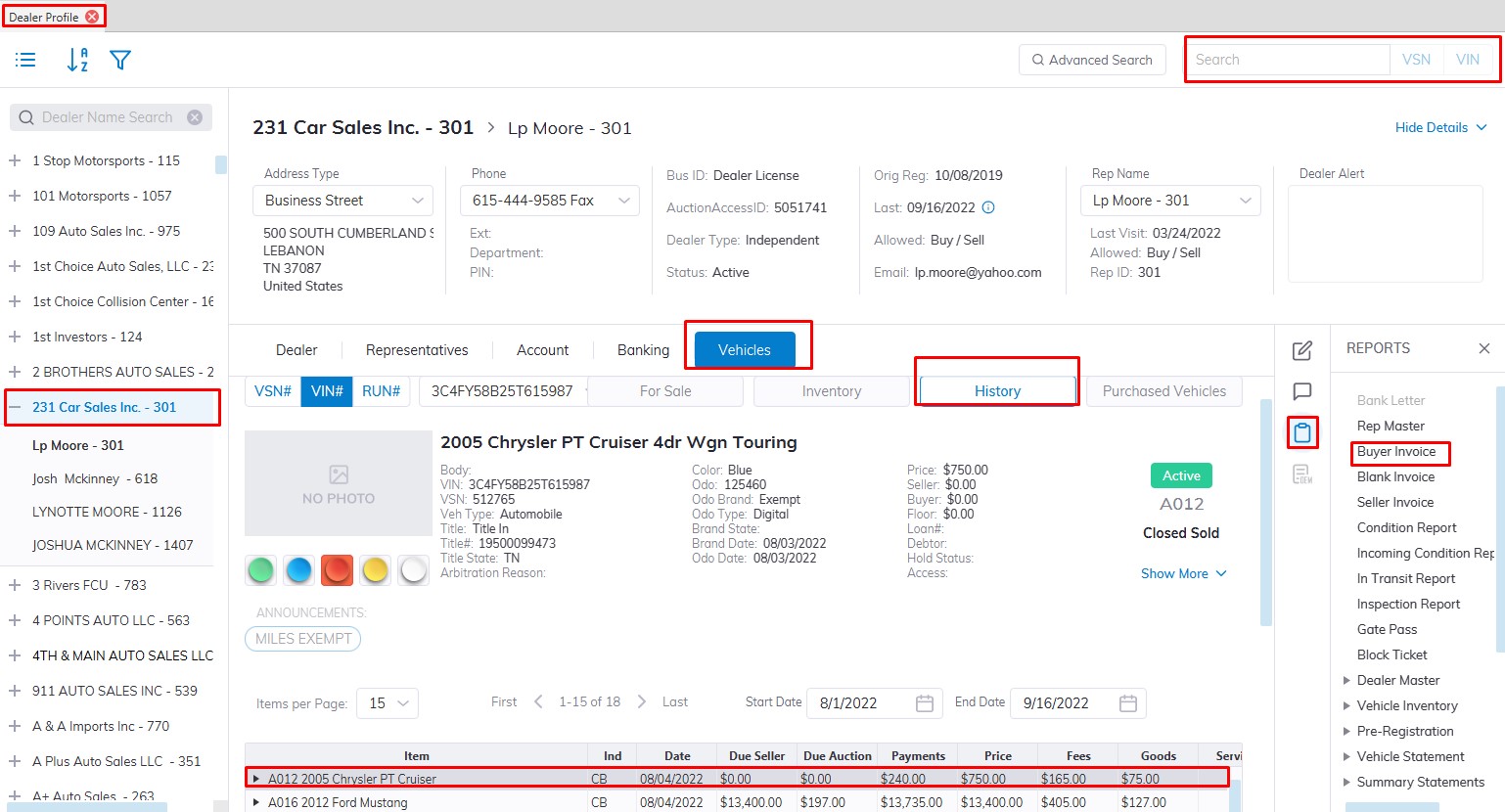 - Select the 'Vehicle Tab' then Sub Tab the 'History Tab' (All Sold vehicles are located here)