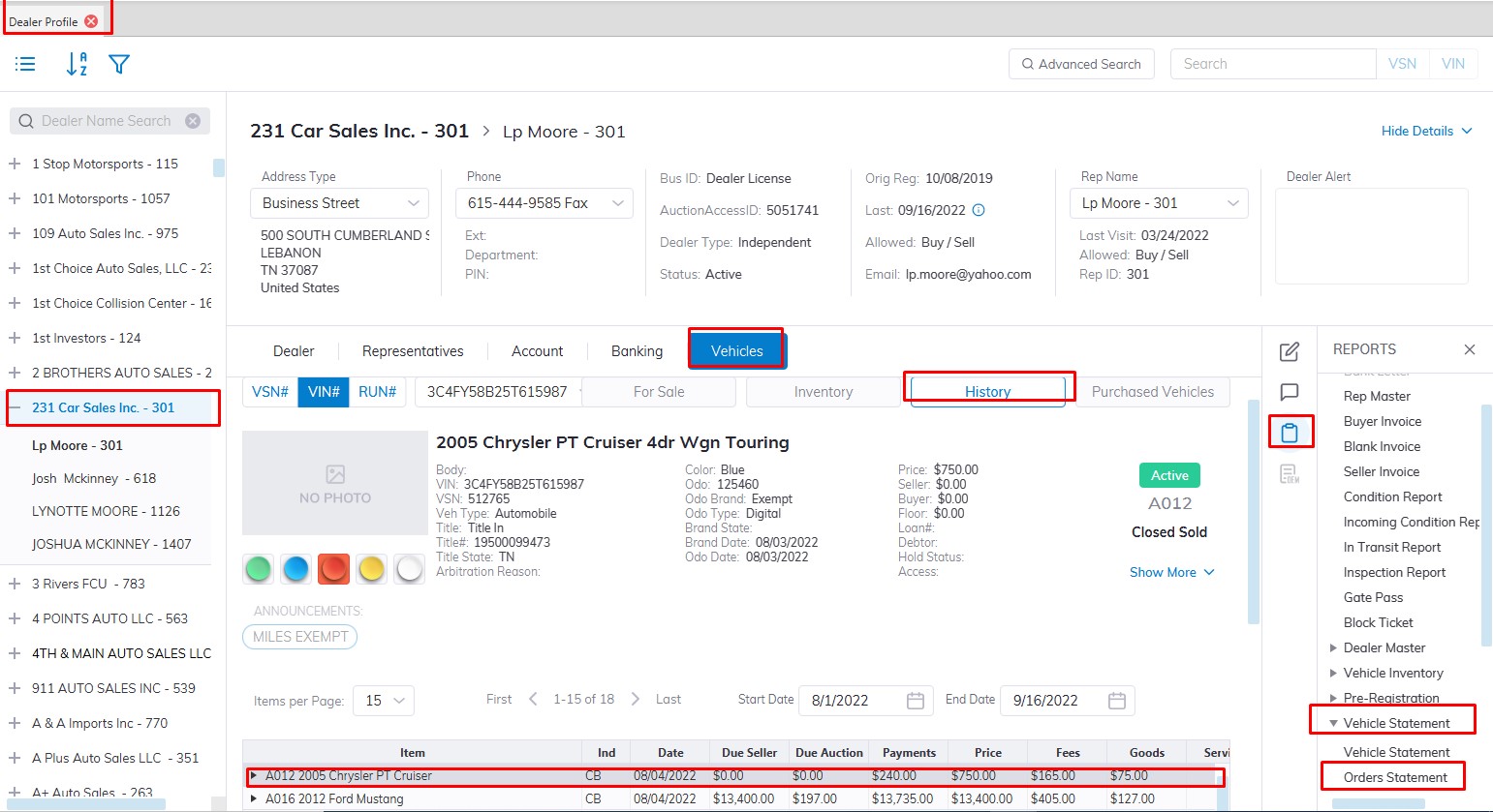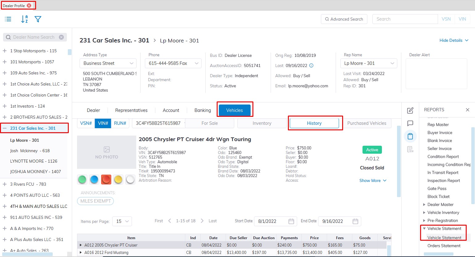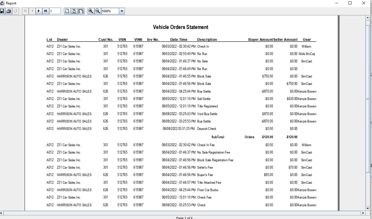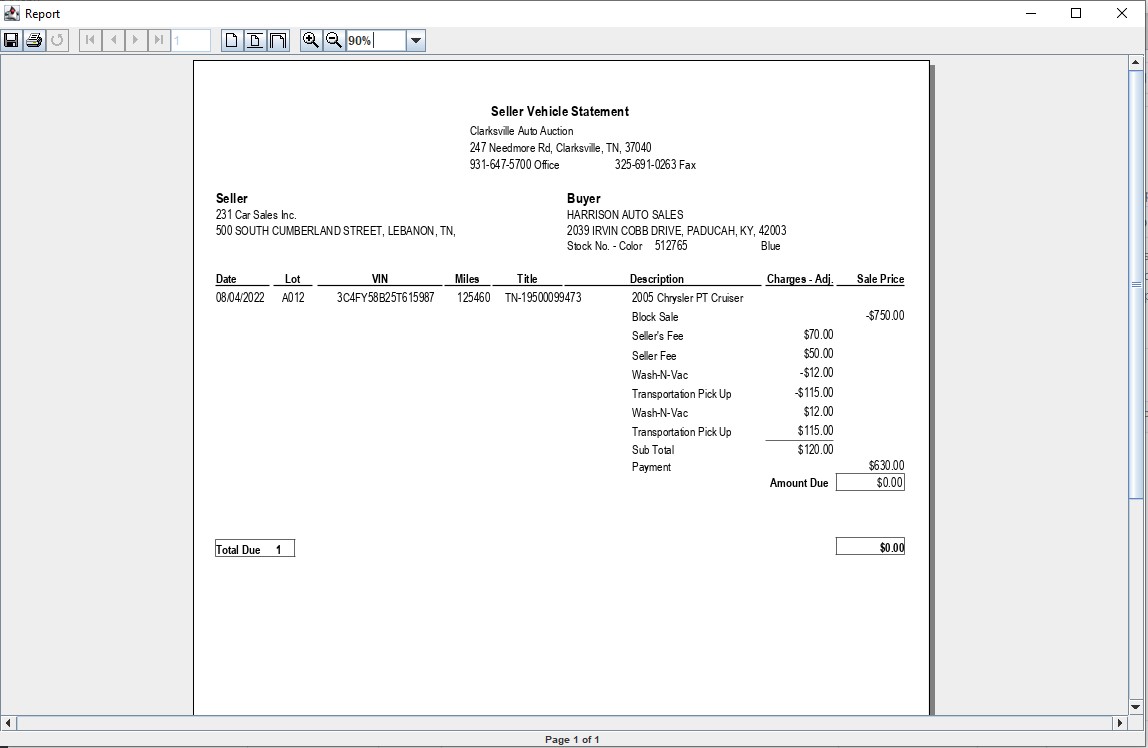 The Vehicle Statement is a detailed report of the fees, payments, adjustments, prices, and payment s (if any) for any selected vehicle.