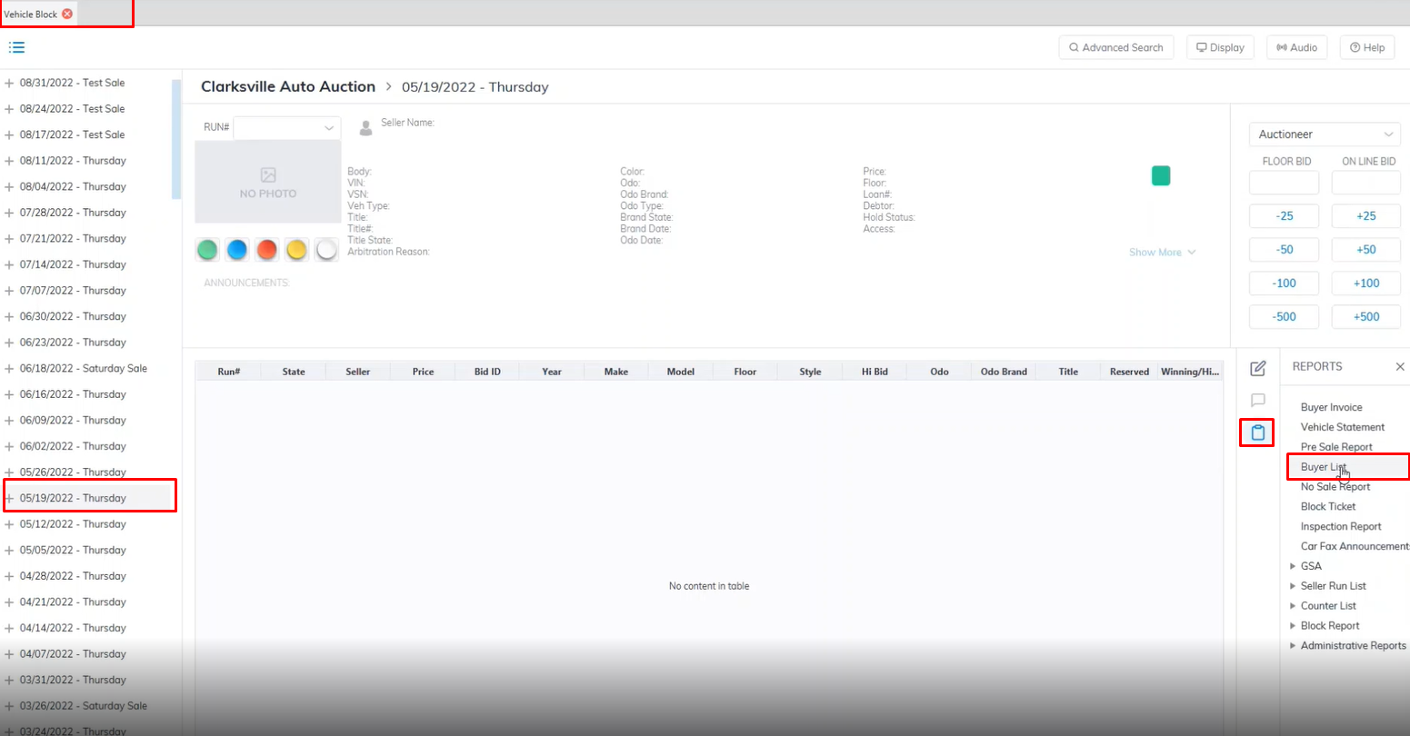 The Buyer Listing report records the vehicle purchased by the Dealer(s). You may run this report from the Sale Profile or Vehicle Block application.