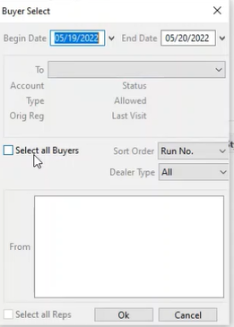 - You can select the All Buyers checkbox to include all buyers or Select a Specific Dealer from the Dropdown.