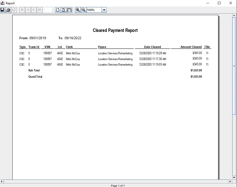 The Cleared Payments report lists only Cleared payments in order of Trans ID. This report is used to reconcile the Auction's bank statement with the AMS System. Using the Clear Payment orders (Cash or Check) the 'Cash in Bank' account GL1020 is reduced.