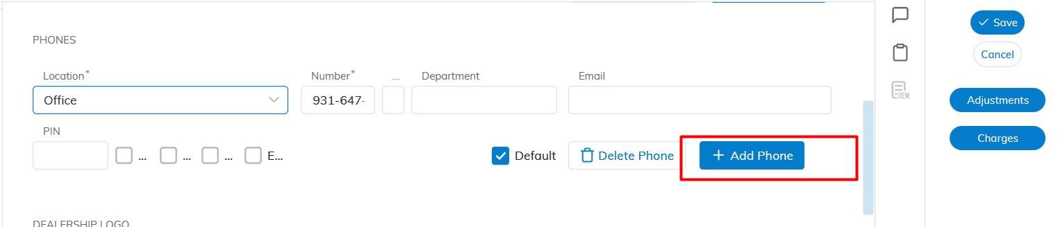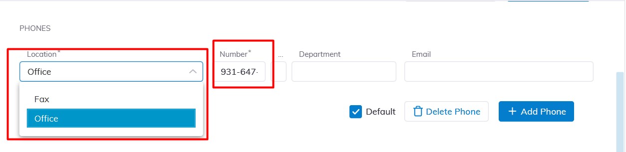 Select the Phone location: e.g. Office, Fax, Mobile, etc.;