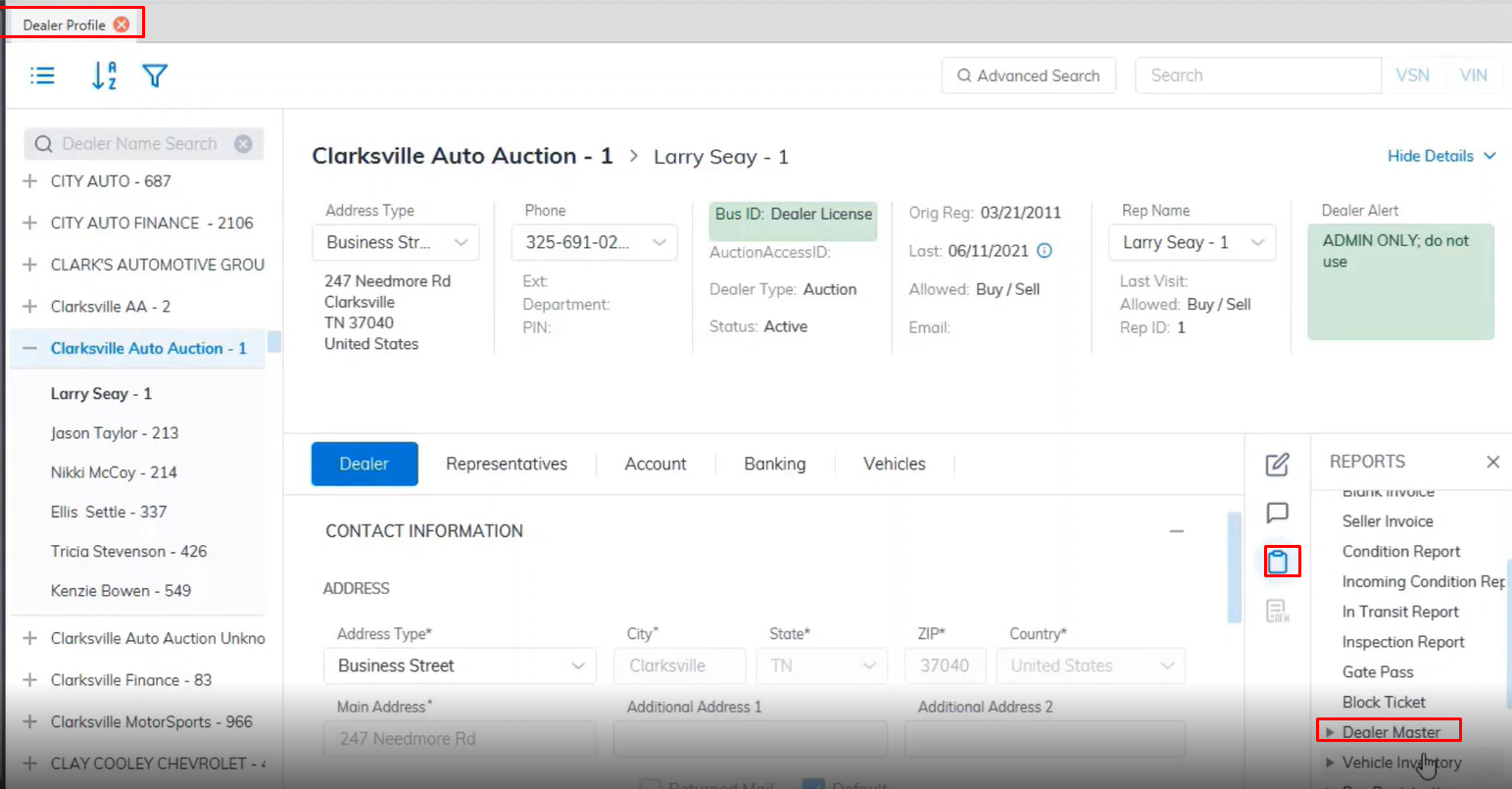 The Dealer Master can be used as a contact list for the Sales department or saved as a . CSV file for use as a spreadsheet. You may run this report from the Dealer profile Application.