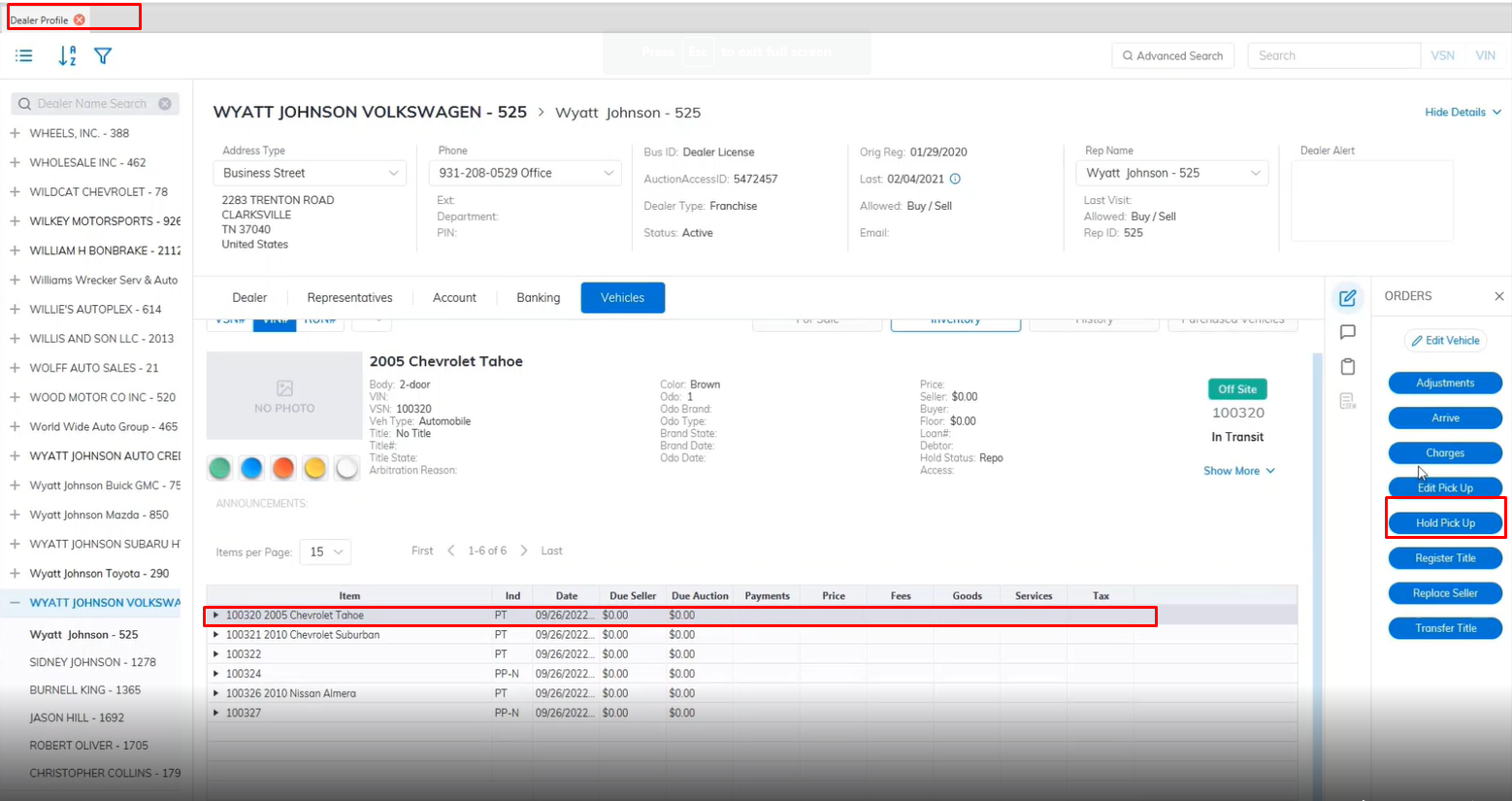- Then select the 'Hold Pick Up' order under the Orders menu on the right.