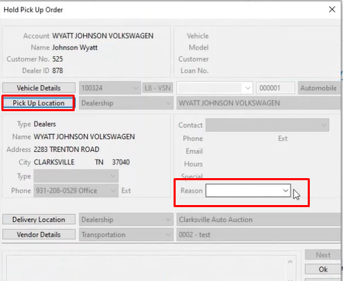 Hold orders can only be issued for Pick Up orders in transit (PT). If you issue a Hold order you will be asked for a Reason code.