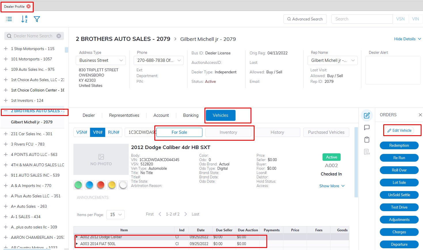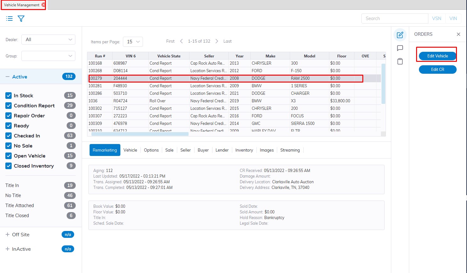 - Then Select any vehicle in the Subsection For Sale or Inventory in the grid.