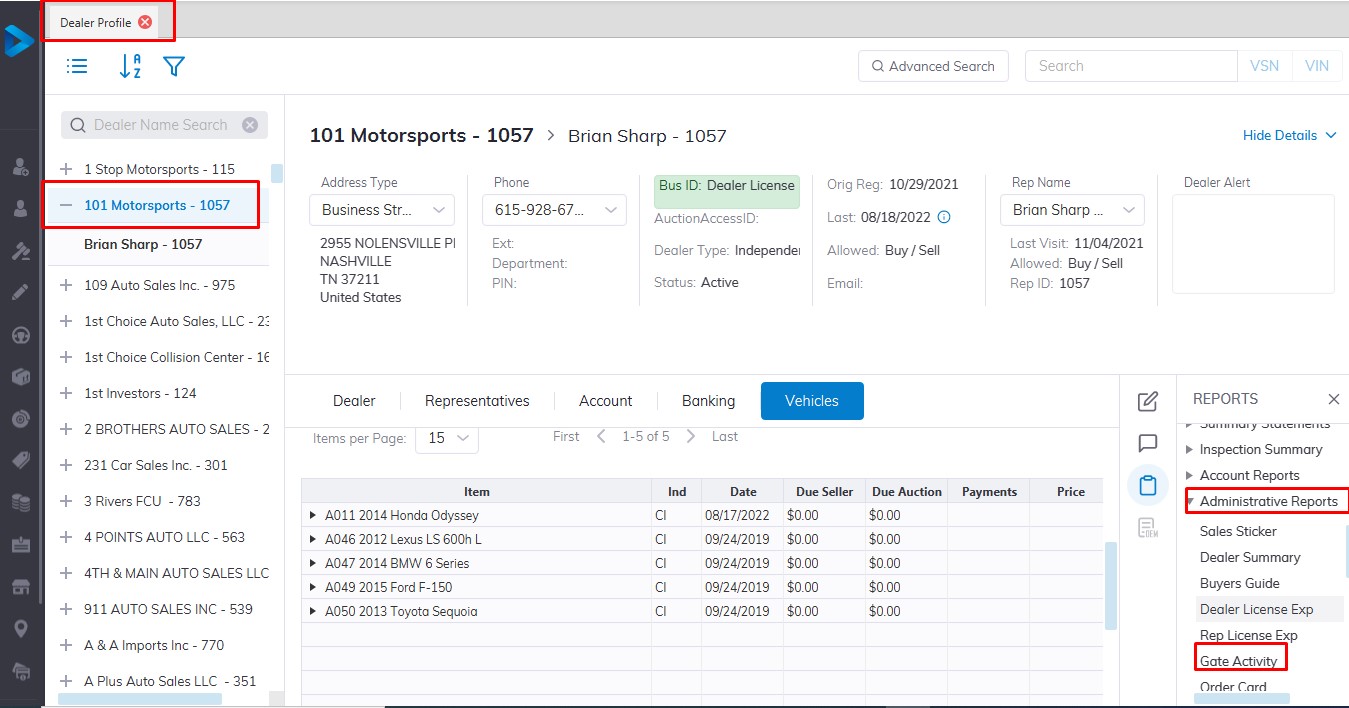 Select the Dealer Profile application > Reports > Administrative Reports > Gate Activity