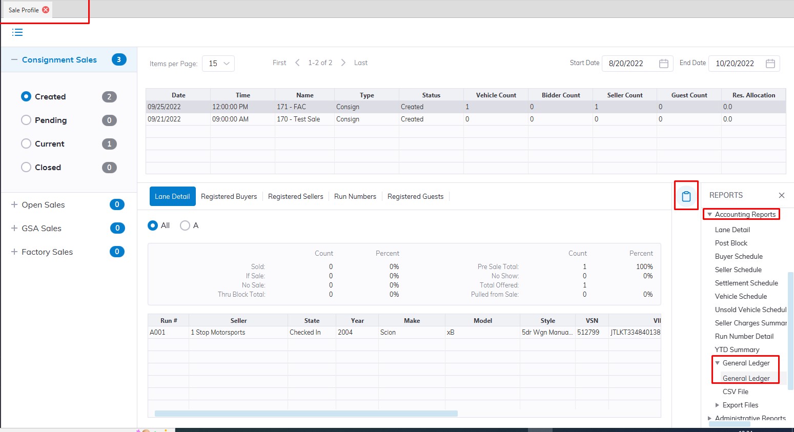 from the Sale Profile select Reports > Accounting Reports > General Ledger