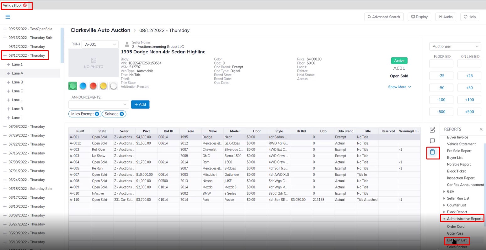 To this Report Select the Vehicle Block application > Reports > Administrative Reports > Lot Turn list