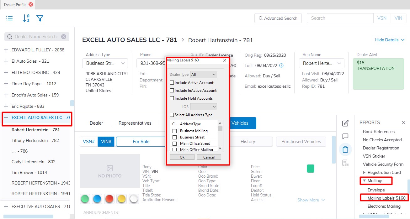The Dealer Profile > Reports > Administrative Reports > Mailing Labels 5160