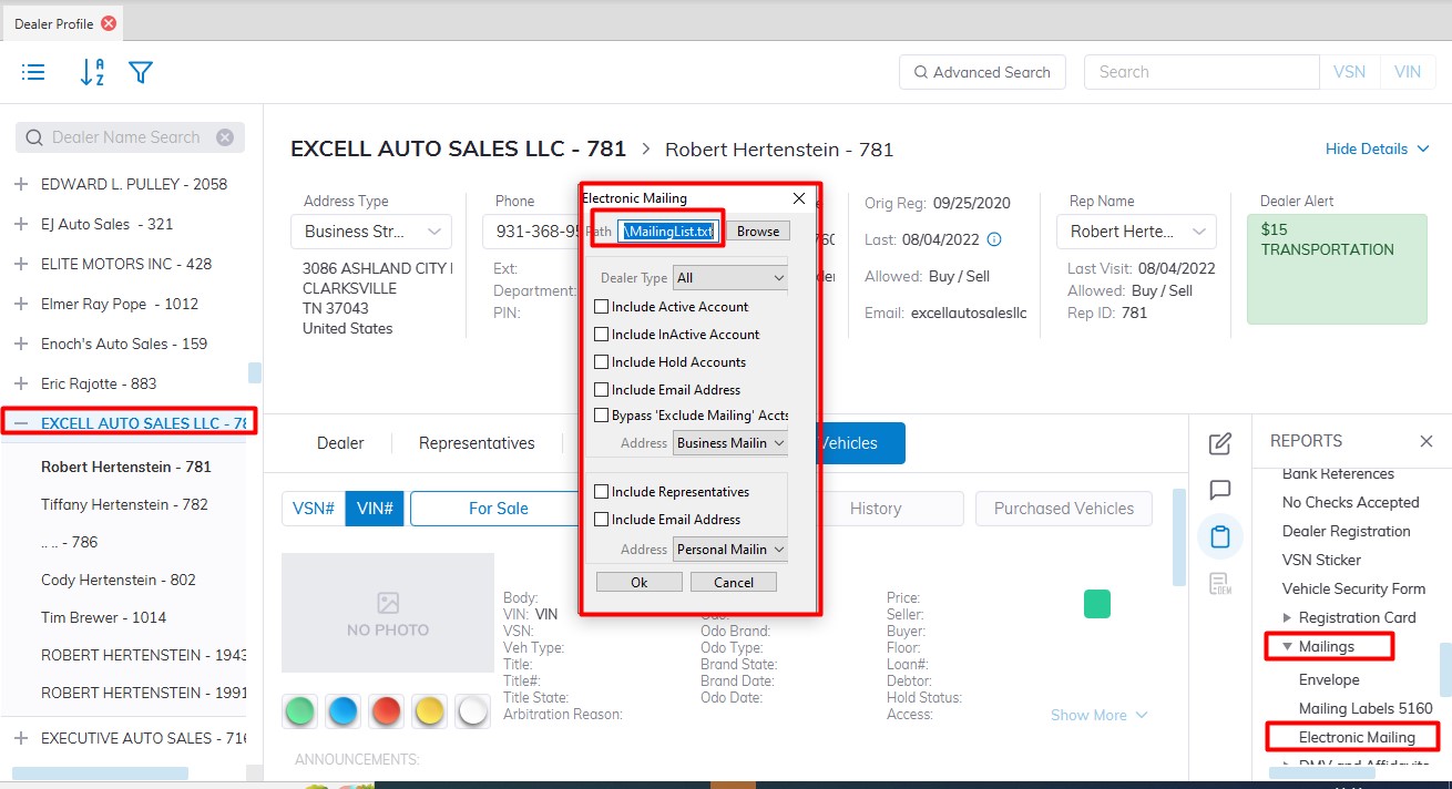 The Dealer Profile > Reports > Administrative Reports > Electronic Mailing