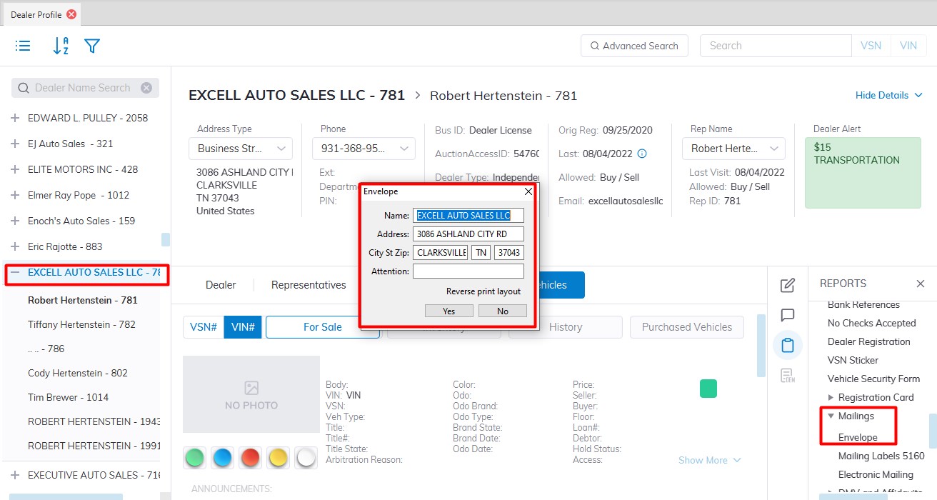 Print the Dealers Address on envelopes