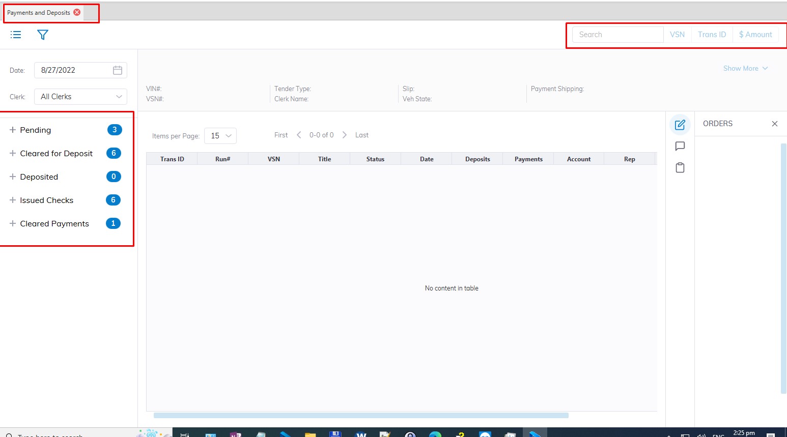 Cleared for Deposit - contains all of the deposits made within the date range shown. The Pending Deposit' sash contains 4 Tender or Payment types each corresponding to a button on the left and a 3-digit indicator in the grid.