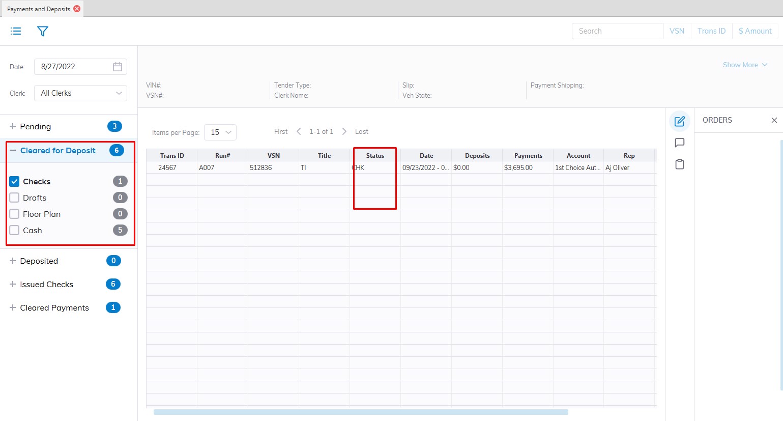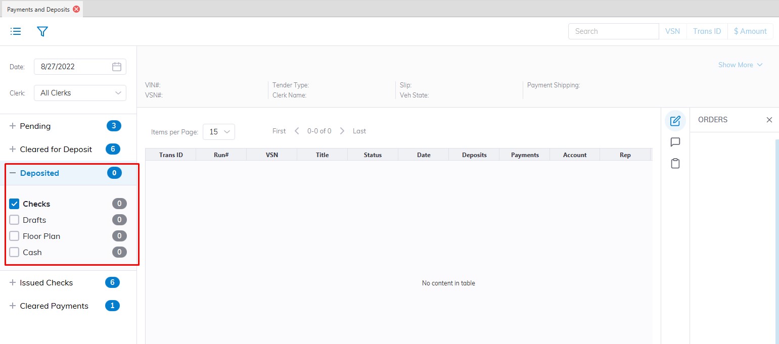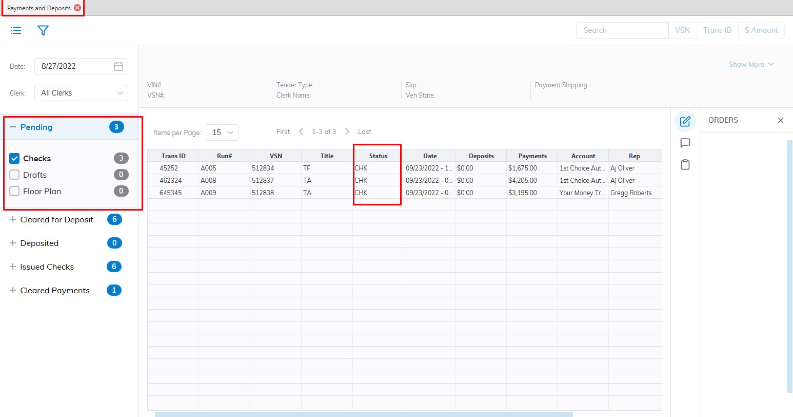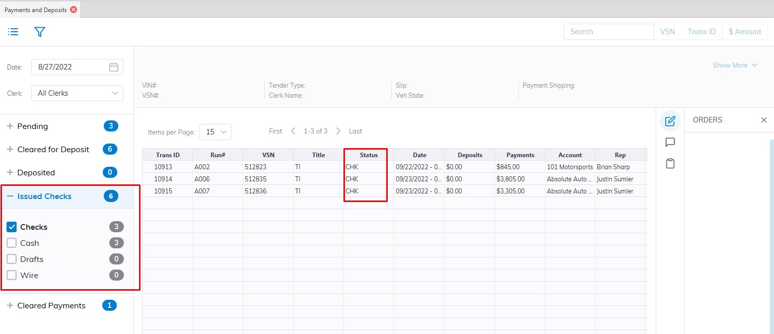 Because Draft and Floor Plan payments may be returned for a number of reasons these payment types are 'Sent' and/or 'Returned' before they are deposited. Checks are simply deposited. It is possible to click the '+' icon next to the payment to view the history of the orders.