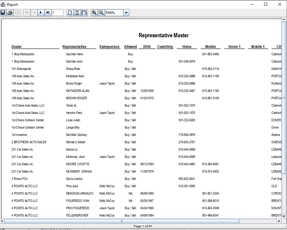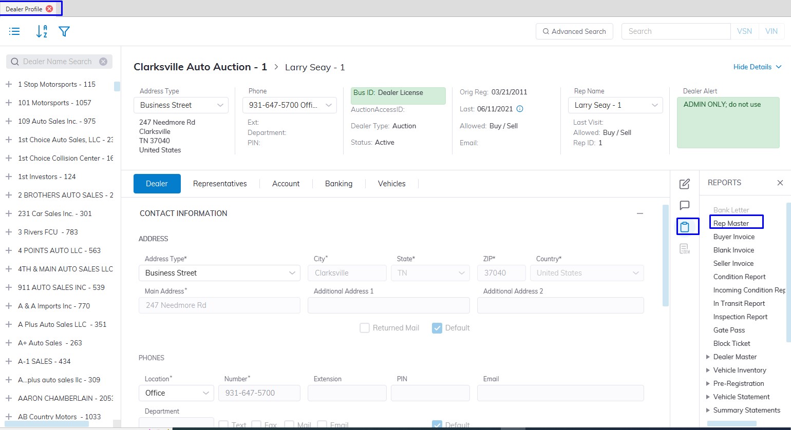 - Select the Dealer Profile application > Reports > Rep Master