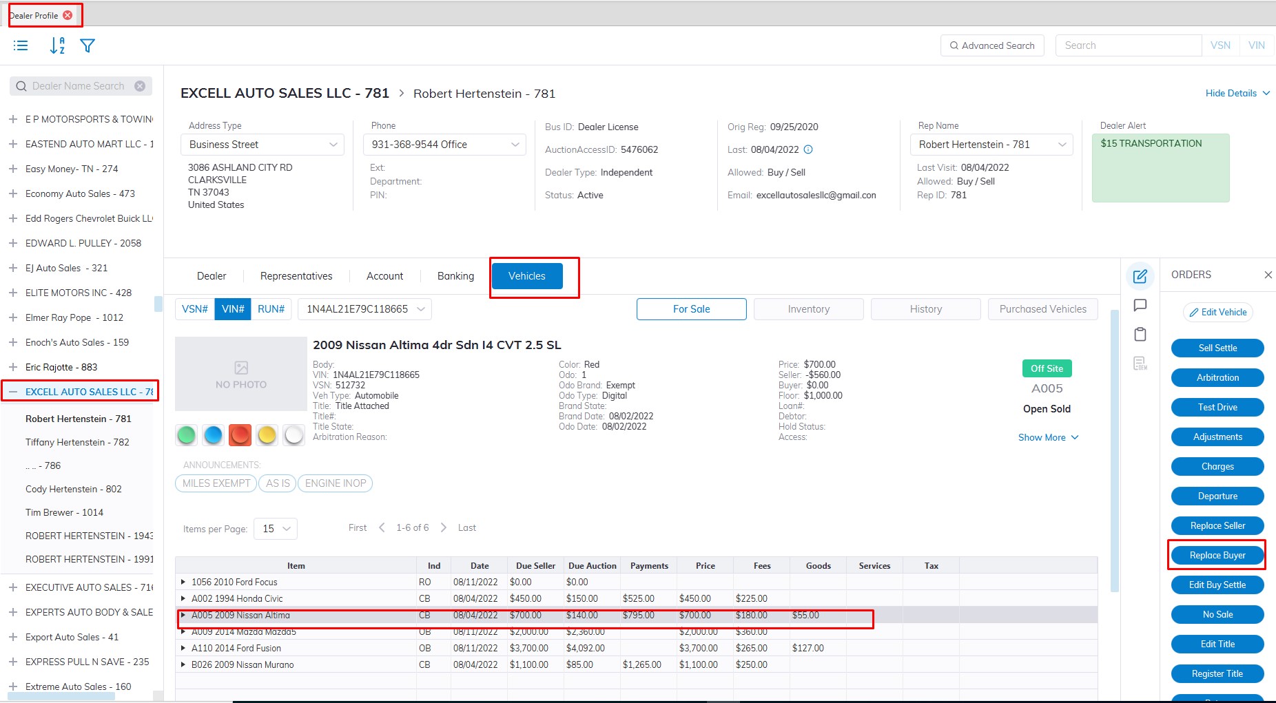 - Select the Dealer where the vehicle you wish to replace the Buyer.