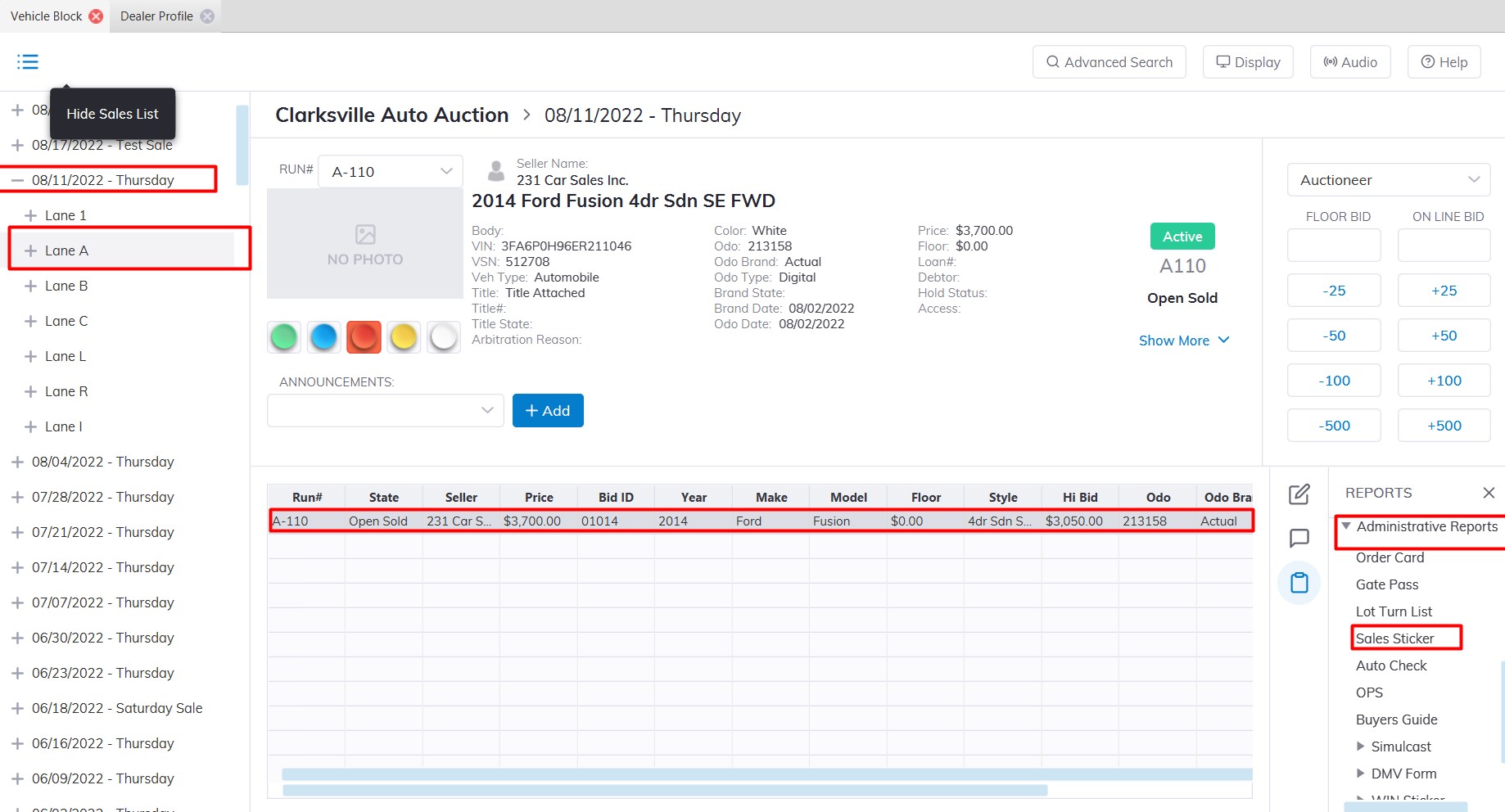 The Vehicle Block application> Reports > Administrative Reports > Sales Sticker