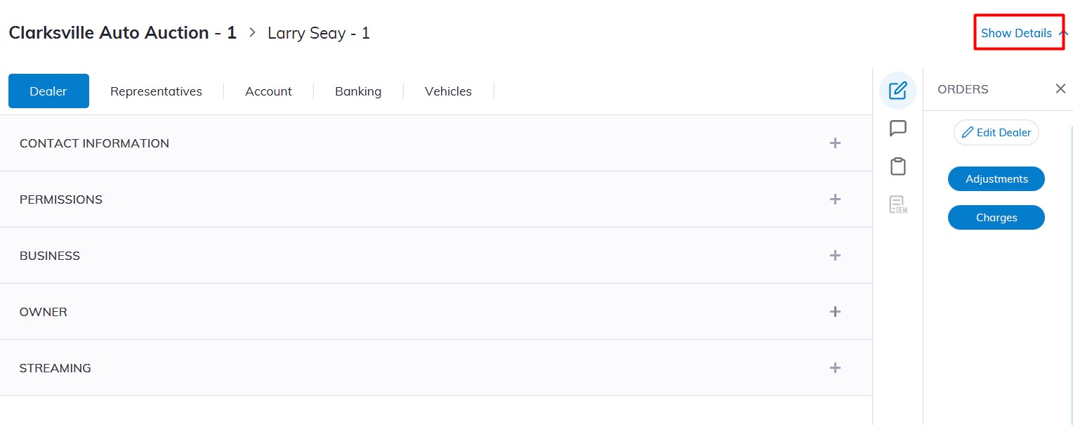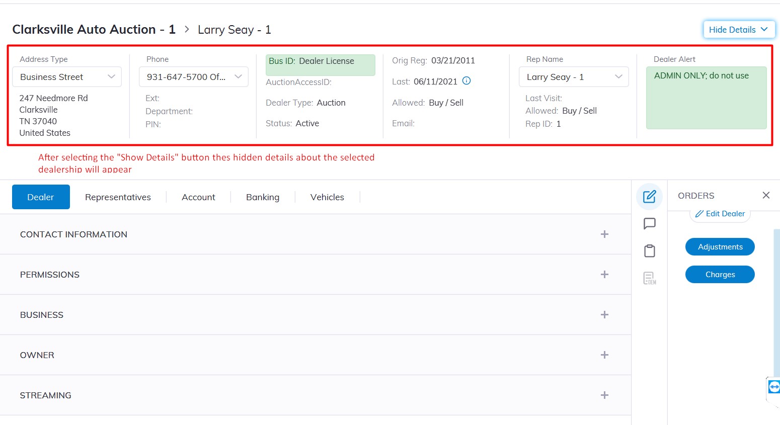 Show Details button: This button unhides hidden details about the Dealer selected.