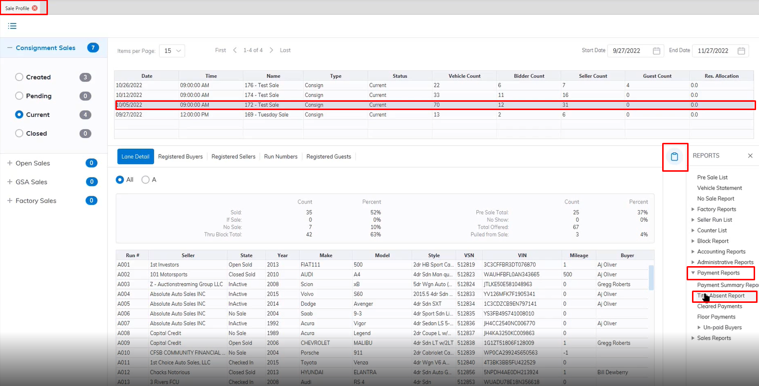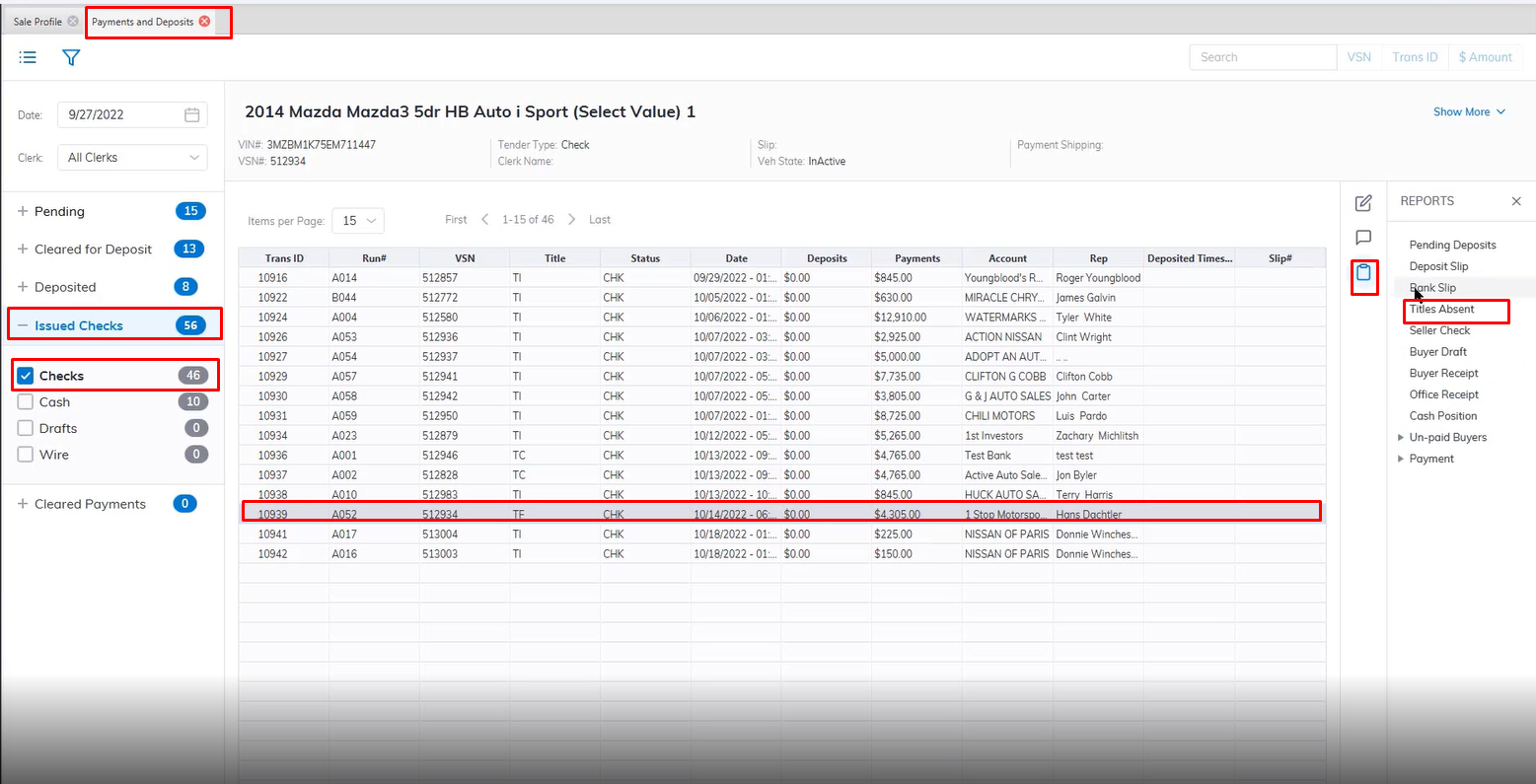 The Title Absent report provides information for vehicles whose titles are outstanding as Title Absent or Title Float. You may run this report from the Sale Profile or Payments and Deposits application.
