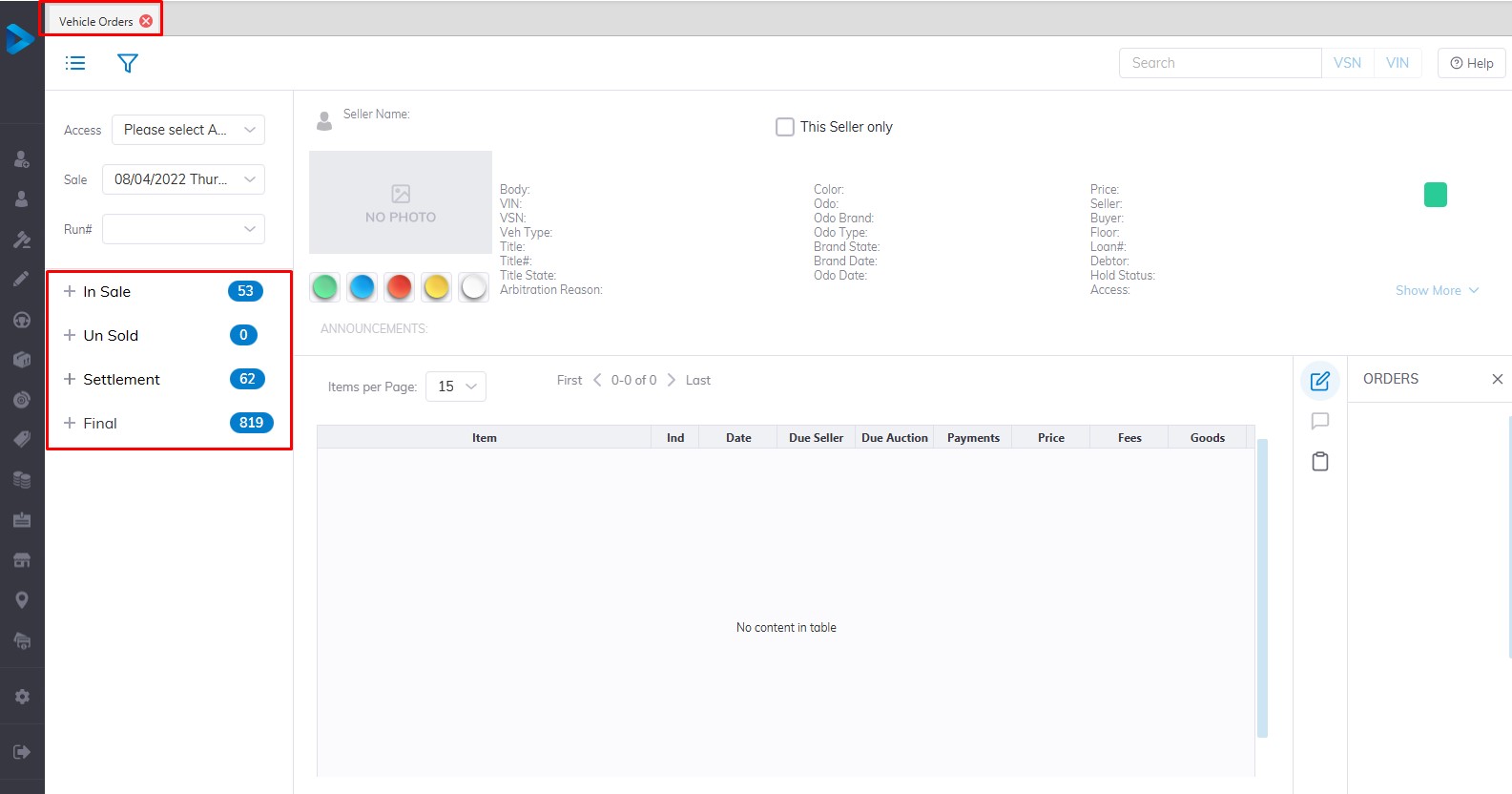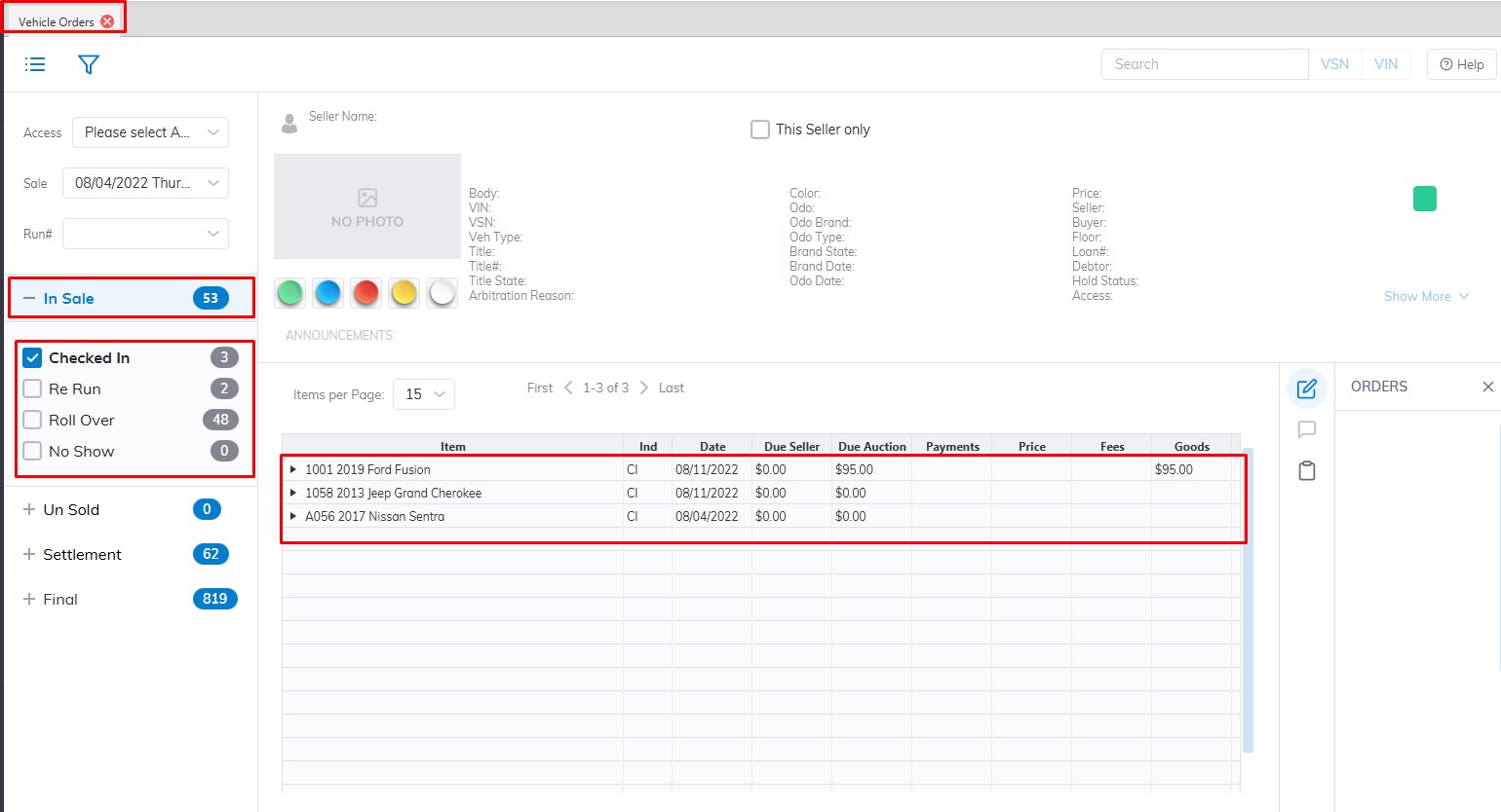 Vehicle Orders application - displays Vehicles that have a Run Number, in addition, all 'Active ' and 'Off-Site ' Vehicles are loaded into this application (regardless of Sale Date). The summary sections contain a selected Vehicle's make, model, and state.