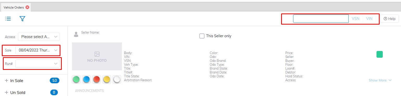 Select Sale Date and Run Number and the application will find the vehicle and highlight it in the grid.