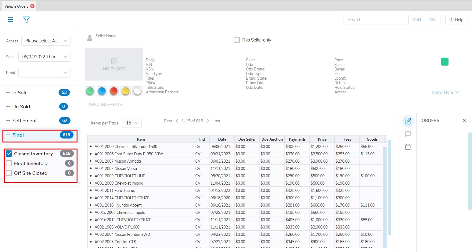 This Vehicle state is a Sold Vehicle with a Buyer payment and a Seller's Check issued. Both sides (buyer and seller) of this deal are Closed. This Vehicle may also be seen in the VehicleTab of the Dealer Profile with a CB for the buying rep and a CS for the selling rep.