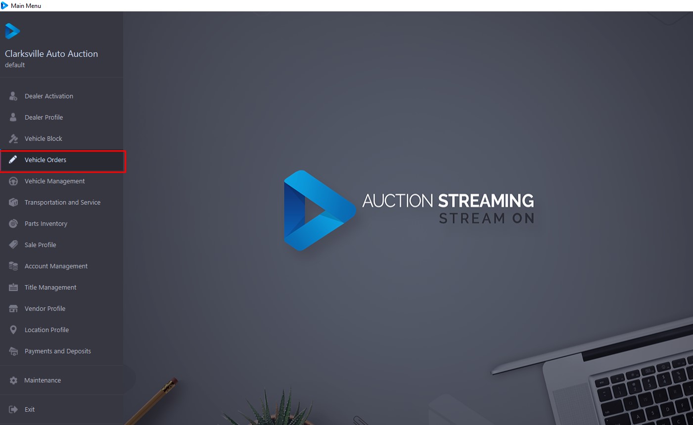 To Open the Vehicle Order application go to the Main Menu >> Select Vehicle Order