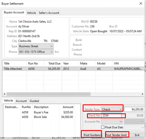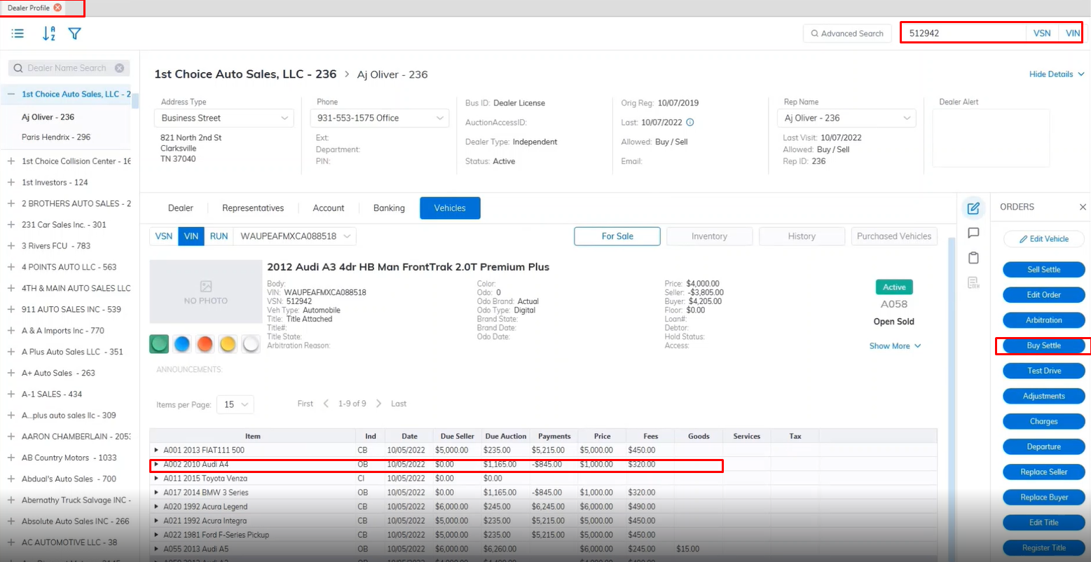 - Buy Settle is done from the Dealer Profile and Vehicle Orders application.