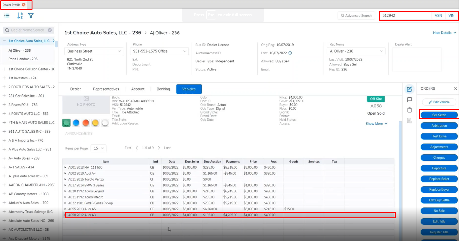 - Sell Settle is done from the Dealer Profile and Vehicle Orders application.