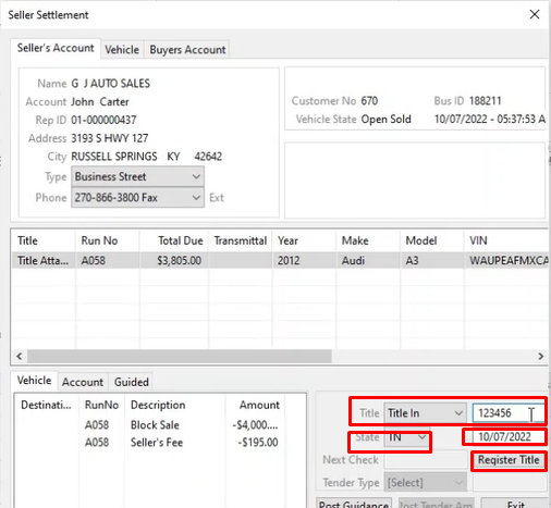 - If the Title is not registered update the Title here and Register it. Enter the Title Number, State, and Date